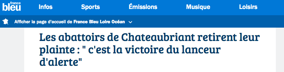 Vous pouvez lire cette semaine dans les colonnes du Canard Enchaîné que l’industriel Castel Viandes, qui avait porté plainte pour diffamation suite aux révélations de mon livre « Omerta sur la viande » paru aux Éditions Grasset a retiré sa plainte la veille du procès. Après réflexion, ils ont dû penser qu’étriller un lanceur d’alerte en plein scandale Lactalis, ce n’était pas très bon pour la com’!