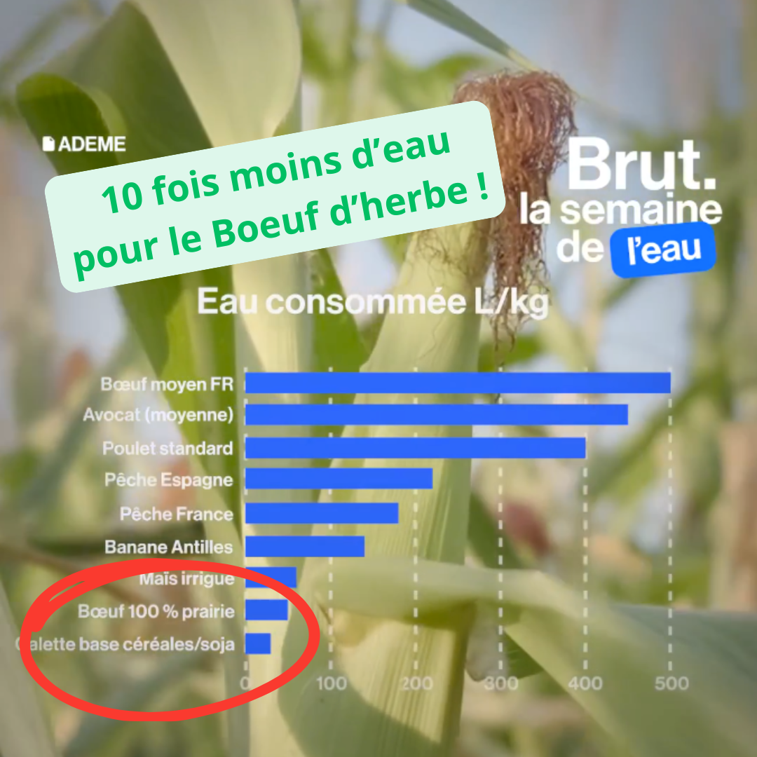 Et c'est pour ça que souvent, on entend parler de chiffres beaucoup plus élevés. On va dire 15 000 litres d'eau pour un kilo de viande de bœuf conventionnel. En fait, 15 000 litres d'eau, quand on regarde ça, c'est toute l'eau qui est nécessaire pour produire du bœuf conventionnel, mais en prenant en compte aussi l'eau de pluie.