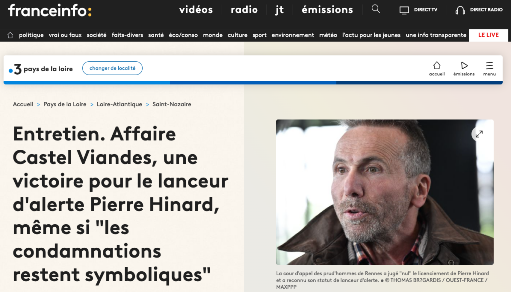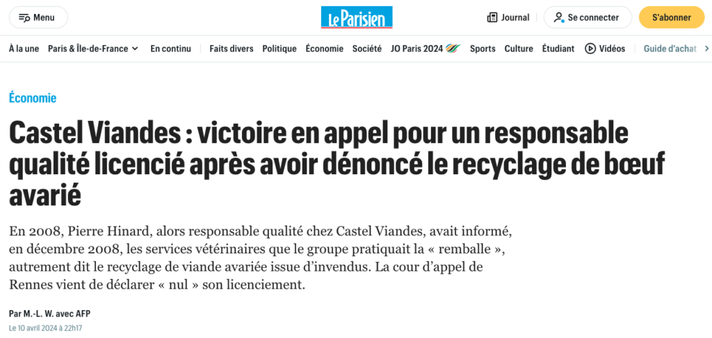 C’est une victoire pour moi, et pour les consommateurs: La justice reconnaît mon action de lanceur d’alerte et annule mon licenciement! Cette conclusion de 15 ans de bataille judiciaire est une première dans l’agroalimentaire qui fera jurisprudence, 1 an après la condamnation au pénal de Castel Viandes.